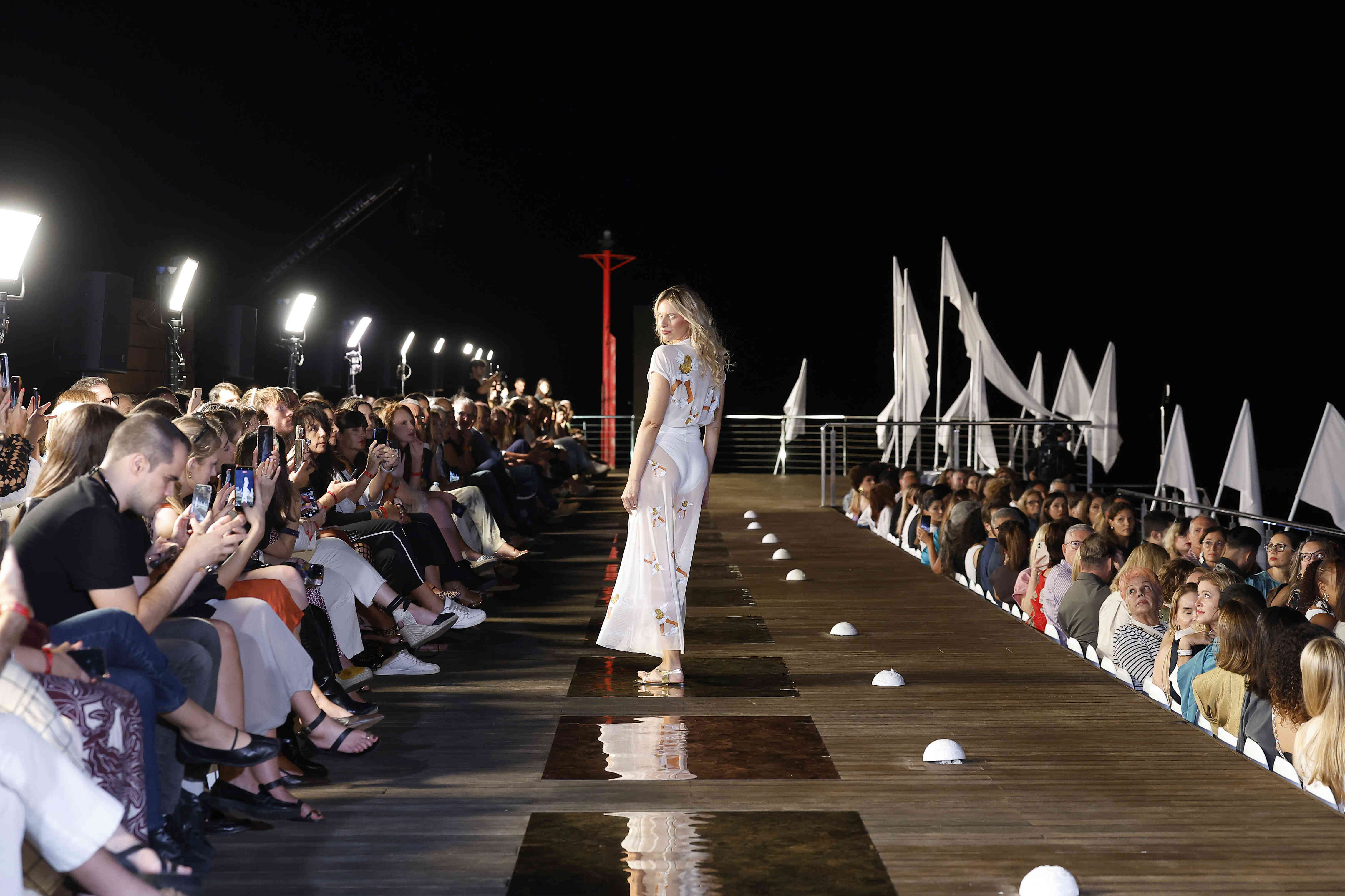 Moda, luz y naturaleza se funden en un mismo reflejo. La pasarela de 135 metros lineales, vestida con espejos dorados, magnífica el entorno: el cielo se dibuja en el suelo, las nubes viajan bajo los pasos de los modelos y los tonos del atardecer brillan con ellos en cada desfile. Alrededor, banderas blancas ondean como parte de la escenografía, abrazando la pasarela.