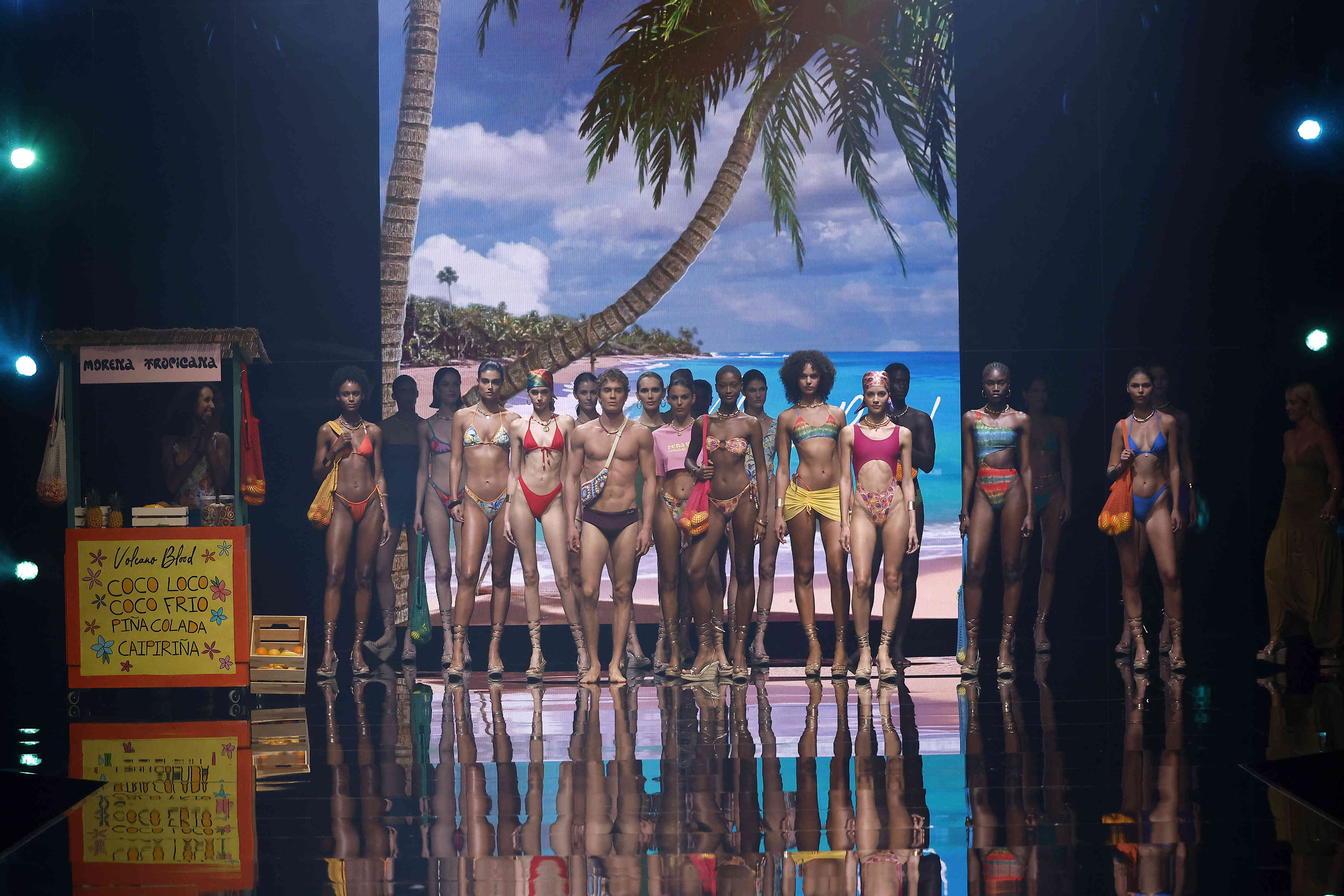 A las 17.00 horas, Volcano Blood (Gran Canaria), firma fundada por las hermanas mellizas, Karen y Sheila, presentaban su colección “Morena Tropicana, eu quero teu sabor” como una carta de amor de Volcano Blood al trópico. No solo es una declaración de estilo, sino una invitación a abrazar el calor, el ritmo y la energía del trópico. La colección está inspirada en la esencia de países como Brasil, Costa Rica, Cuba, Jamaica y Colombia. Se caracteriza por una fusión de colores vivos, inspirados en los paisajes exuberantes, las playas doradas y los atardeceres multicolores de estos destinos. Los tonos vibrantes de la flora y fauna se mezclan con patrones tropicales que evocan la naturaleza salvaje y las tradiciones caribeñas y latinoamericanas.