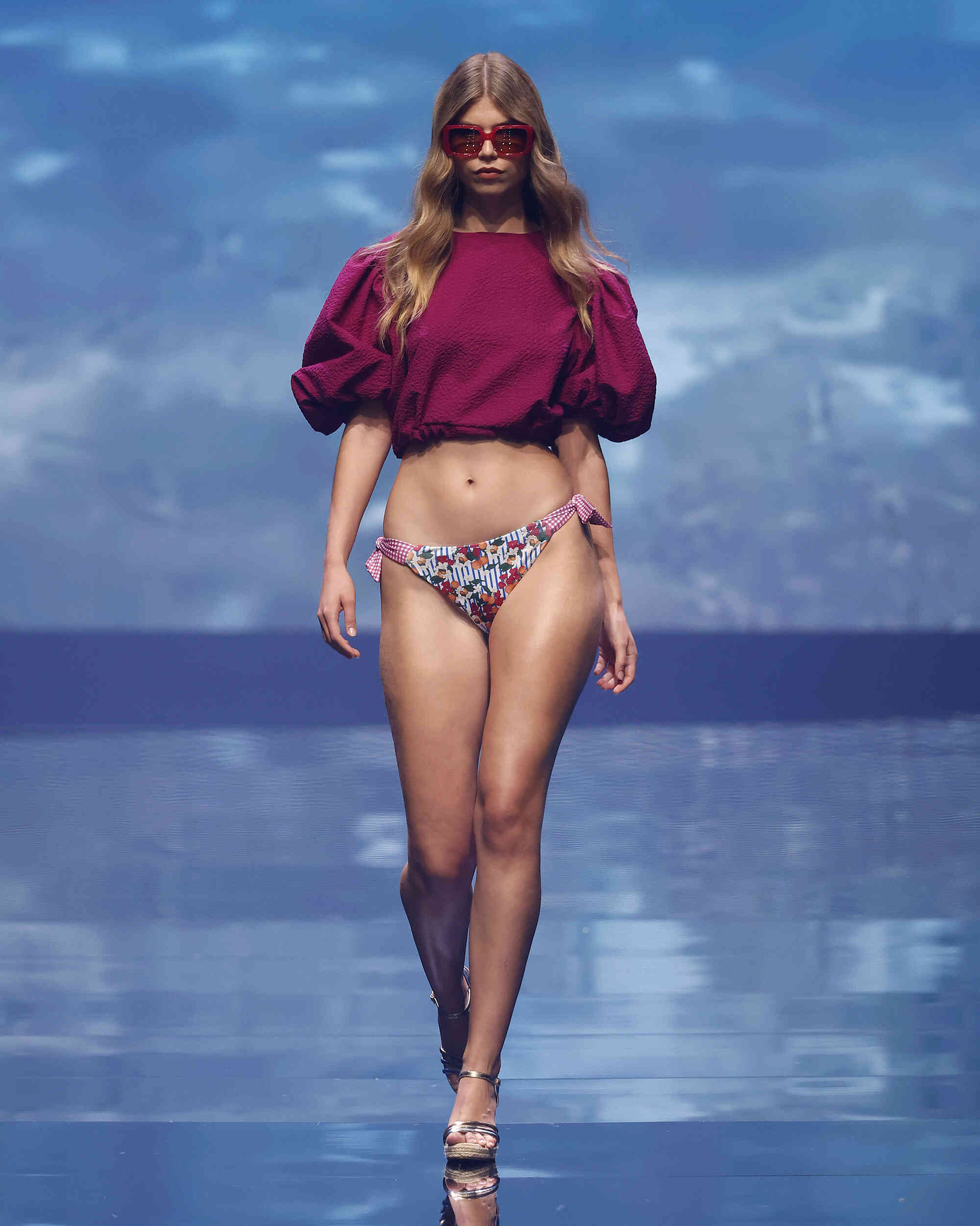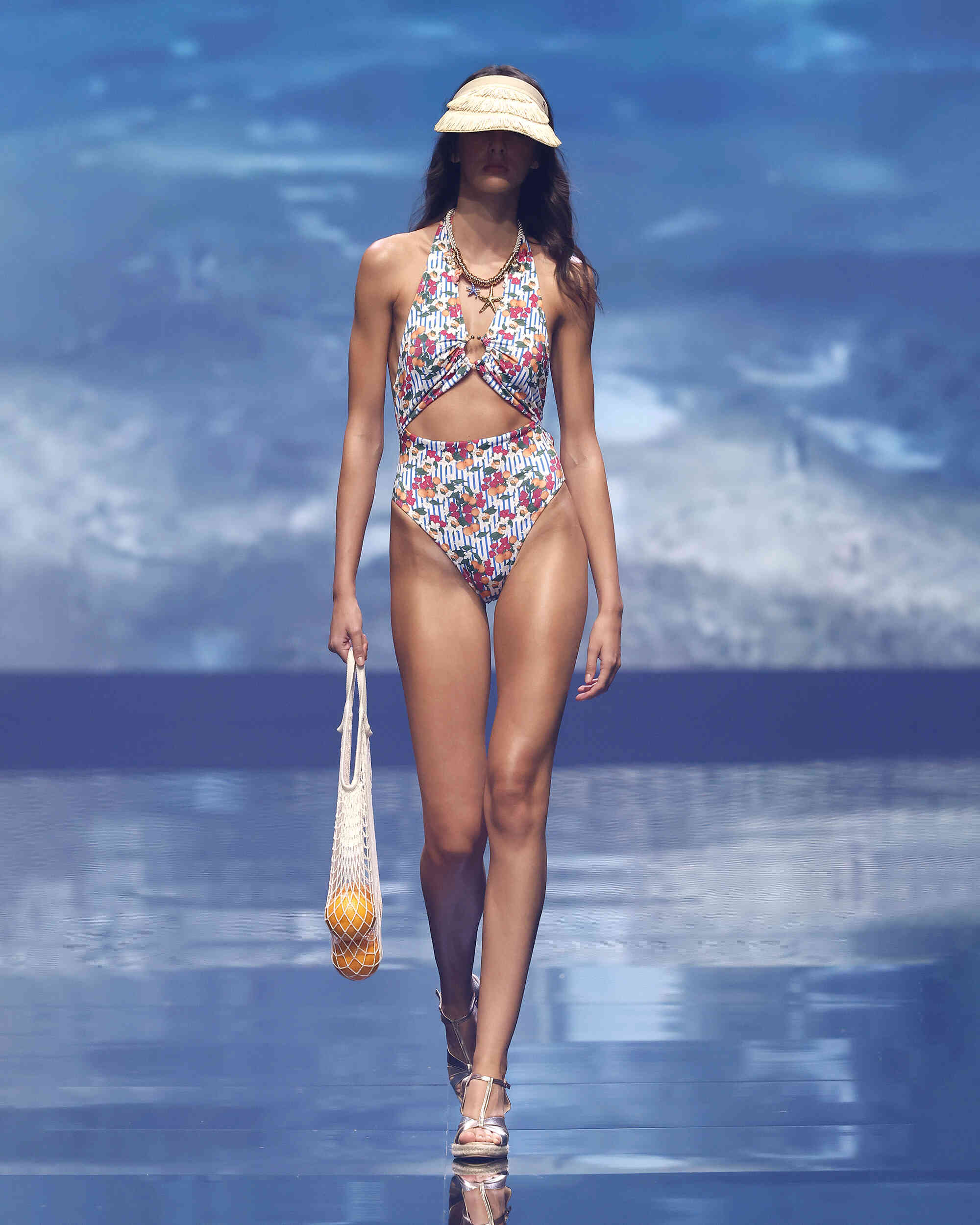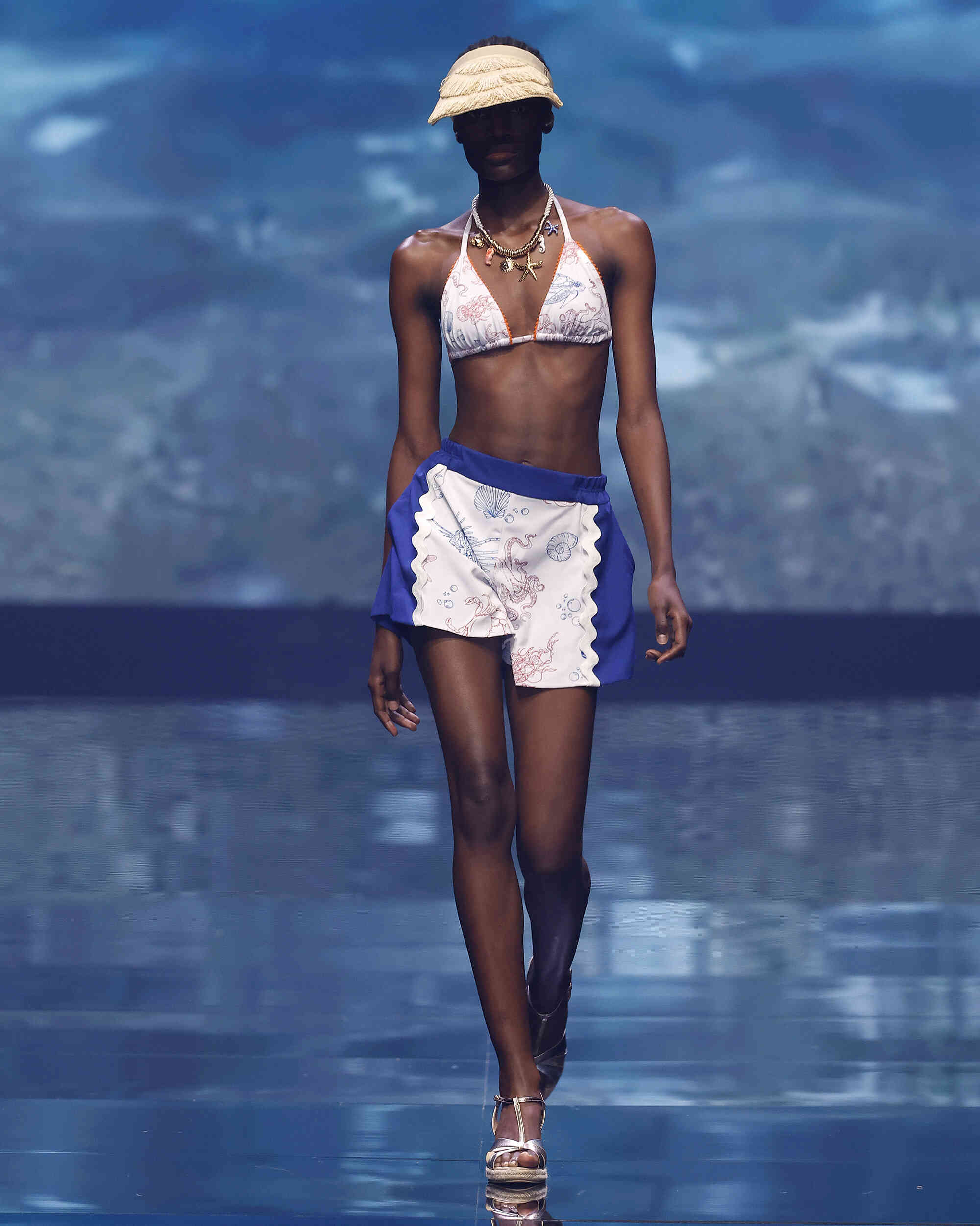 Desarrollada 100% en España, esta colección celebra la belleza y sostenibilidad en cada detalle. En ella los colores azul, blanco, fucsia y naranja se fusionan con estampados exclusivos que evocan elementos del mar y la tierra. Los bañadores y bikinis de cortes favorecedores, confeccionados con lycras recicladas o reciclables certificadas, se complementan con pareos, vestidos, camisas, pantalones y chaquetas en tejidos ligeros como gasa y satén de algodón entre otros.
