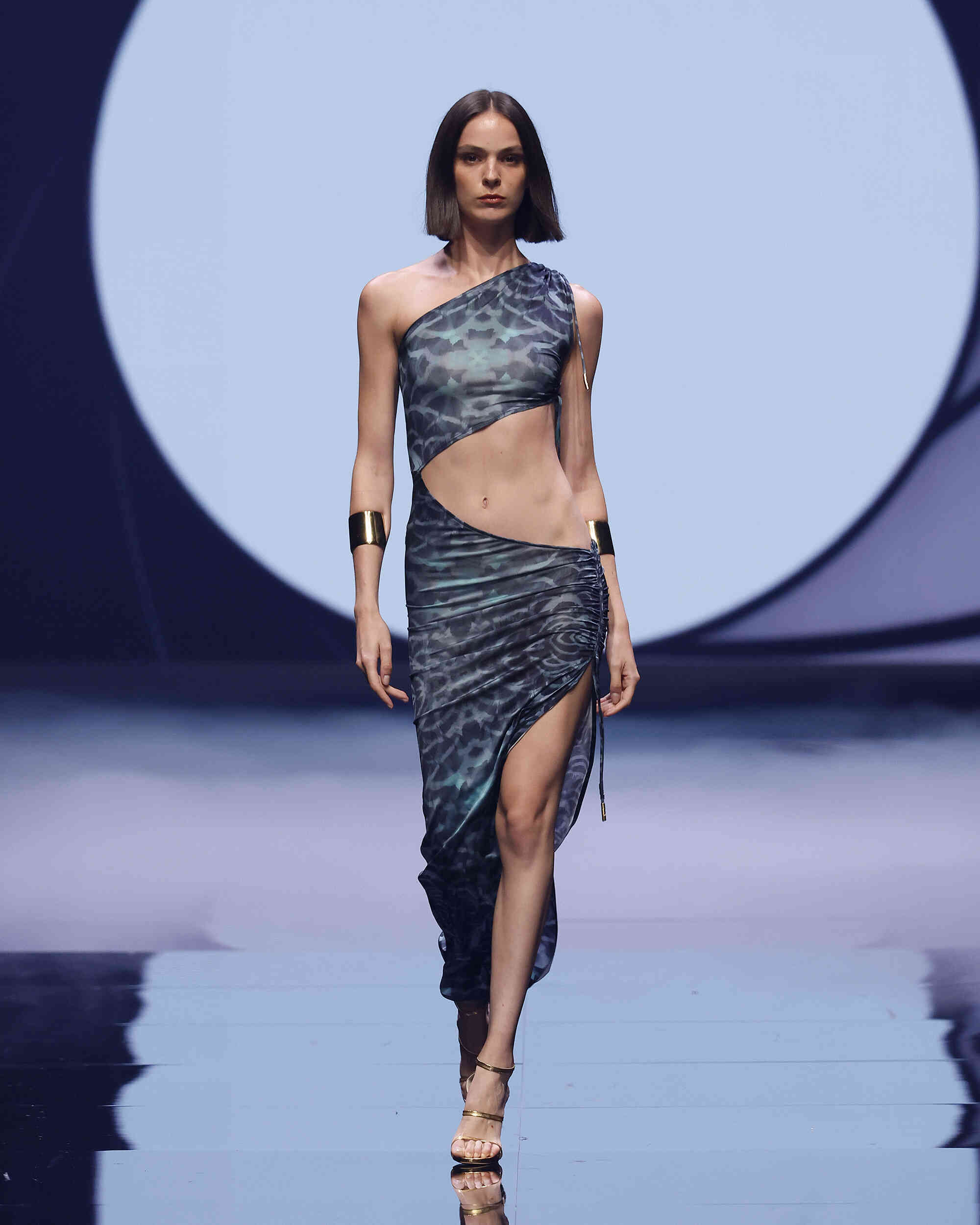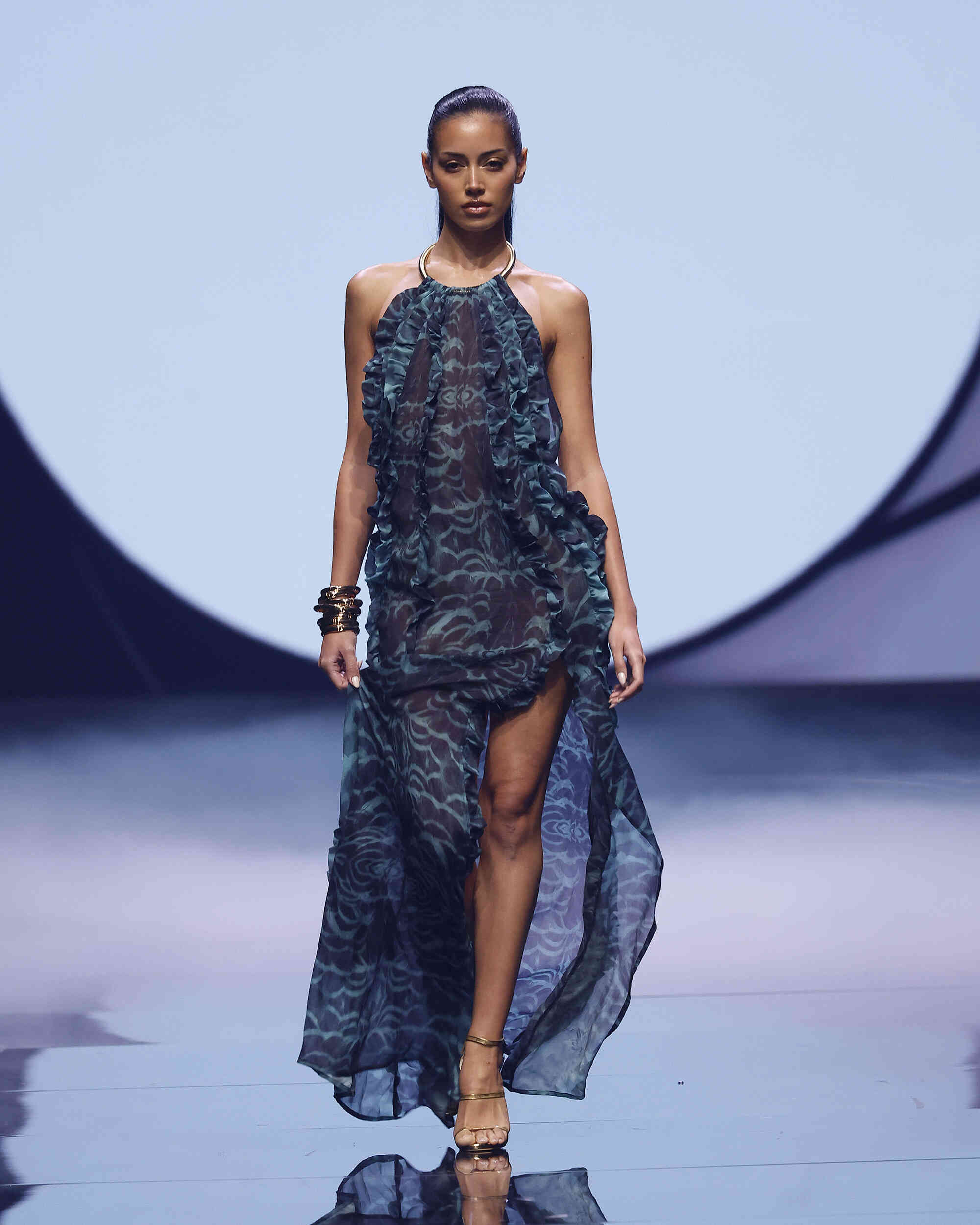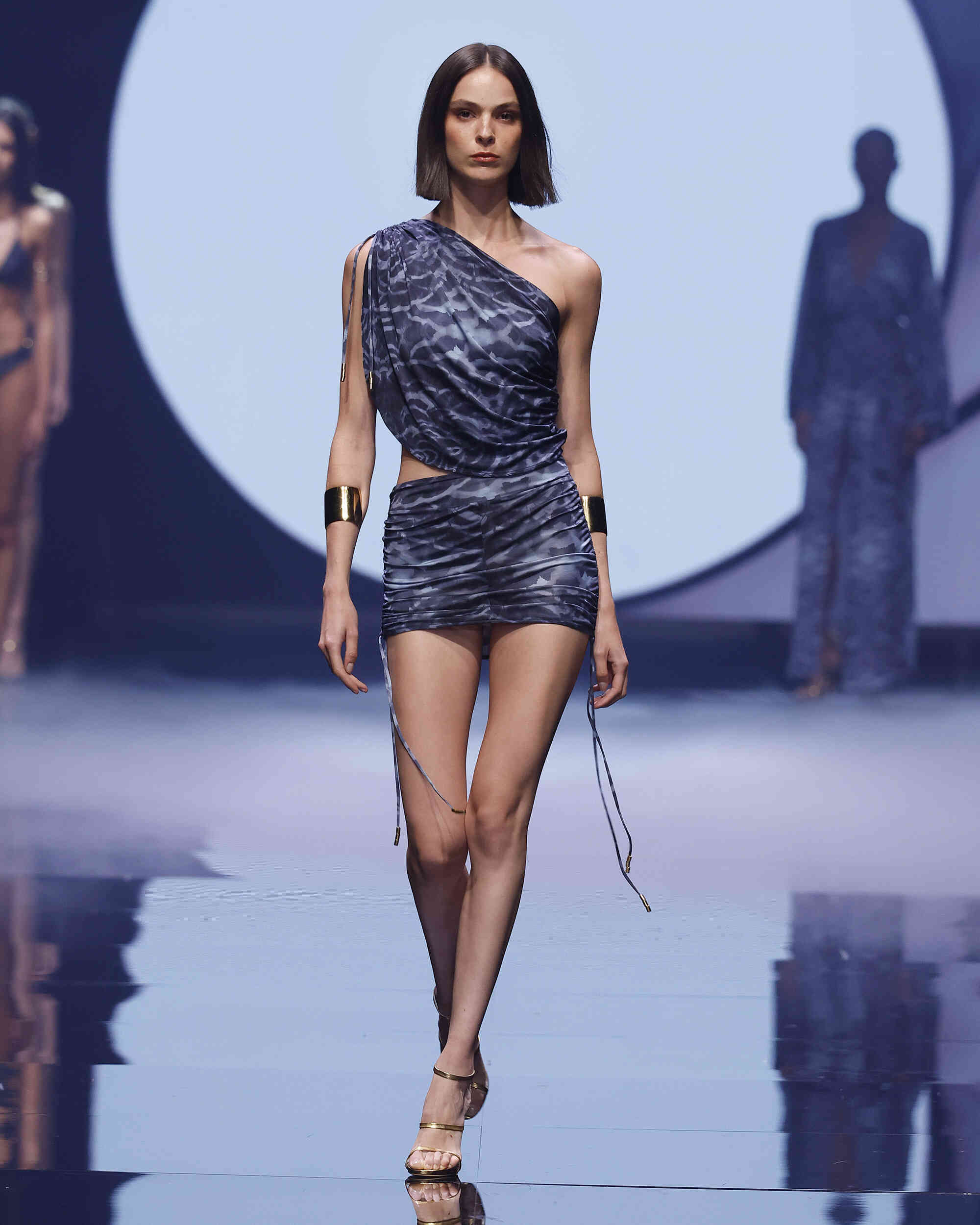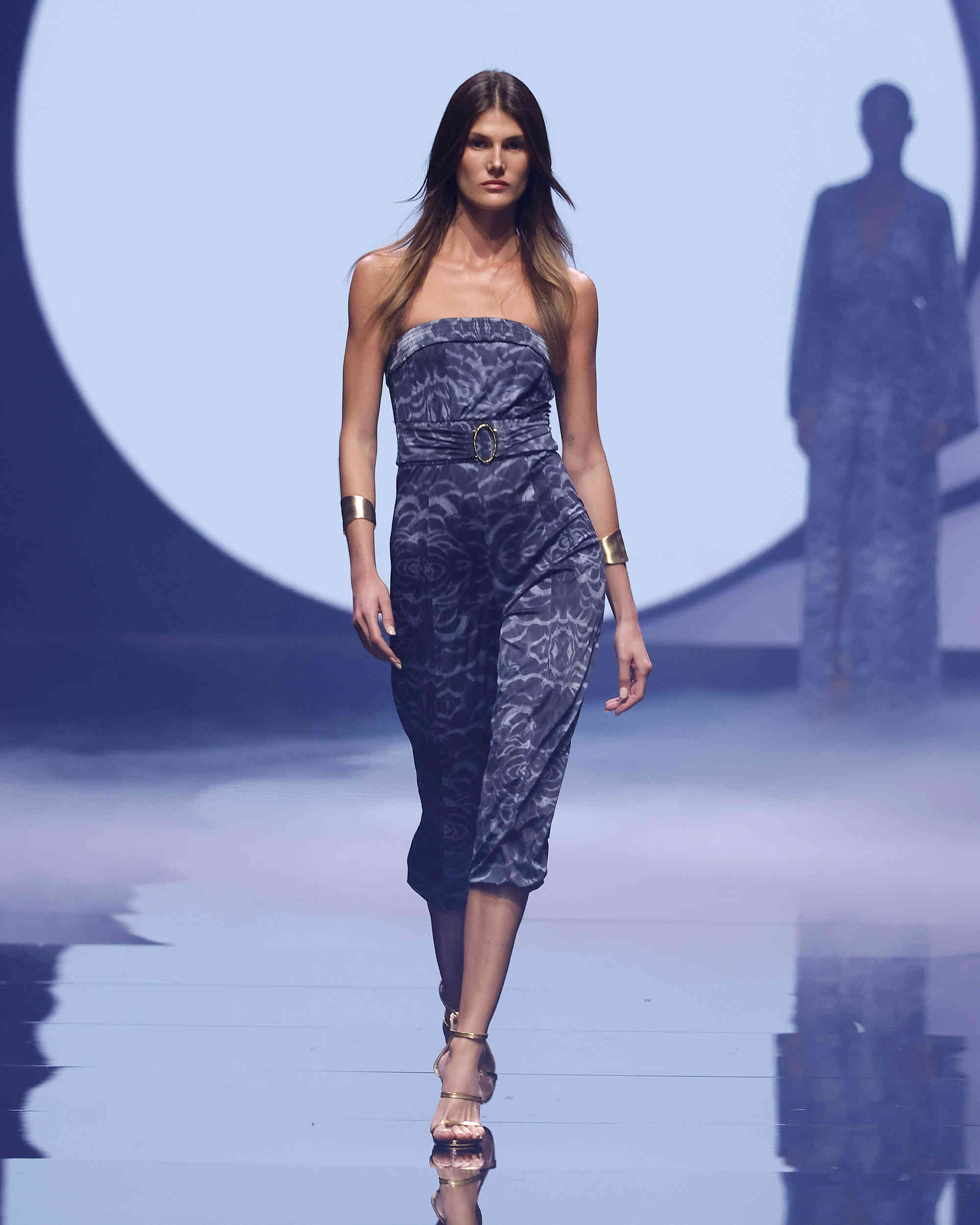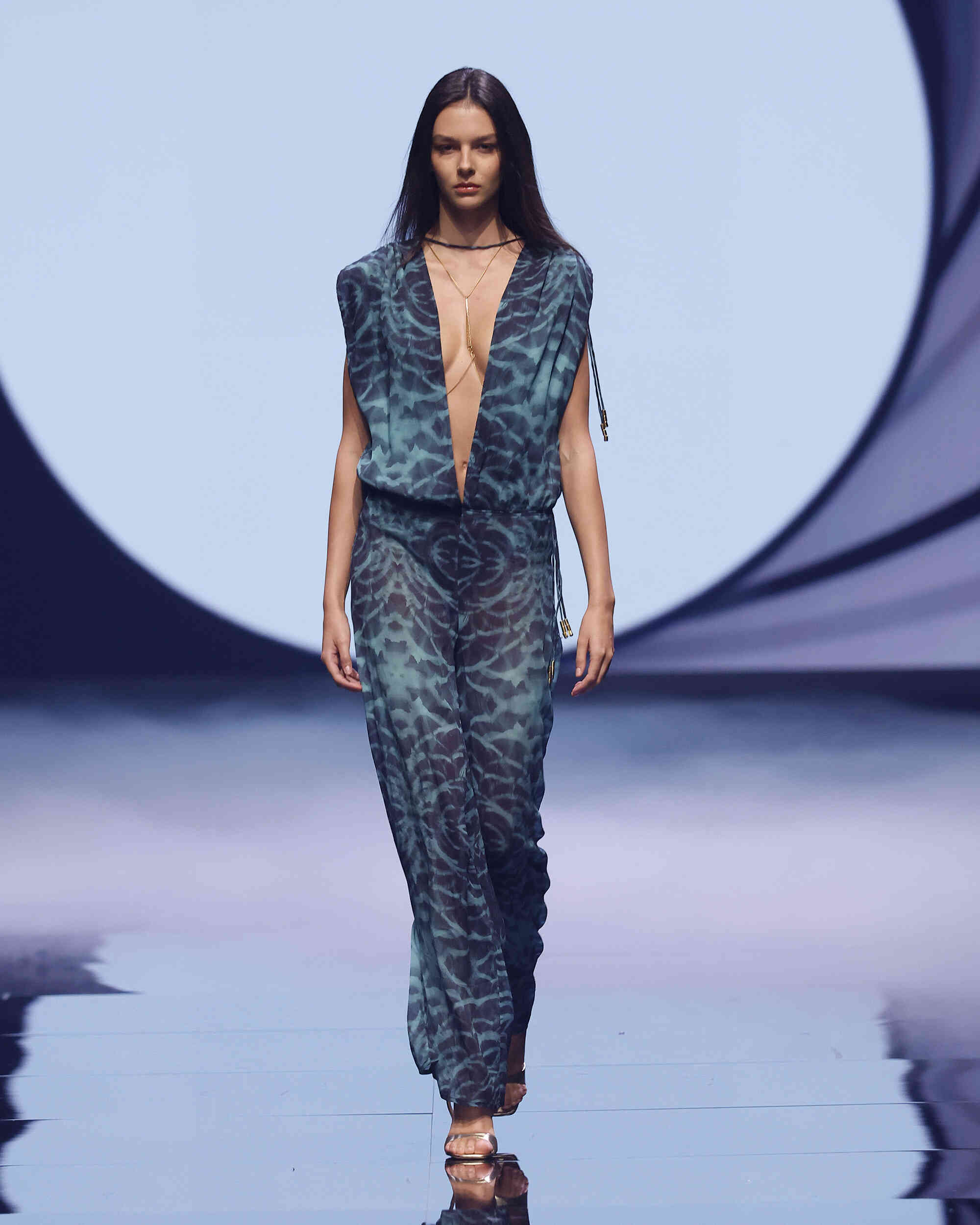 Carlos San Juan propone una Colección, envuelta en un halo de misterio y sensualidad. Diseñada para mujeres sexys y sofisticadas, esta Colección es una invitación irresistible a celebrar los días y las noches en los destinos más exclusivos del mundo. Prendas de vestir confeccionadas en tejidos de chiffon y jersey de viscosa, acarician la piel en cada movimiento. Cada prenda es una obra de arte, diseñada para abrazar y celebrar el cuerpo femenino, destacando su belleza y sensualidad de manera natural. Destaca el personalísimo estampado, que en contraste con las piezas metálicas doradas, crean una presencia sofisticada y atemporal. En esta Colección el color protagonista es el Gris Vulcano, que se muestra en tonos lisos o mezclándose sutilmente con el Verde Jade, el Azul Iris y el Rosa Mexicali.