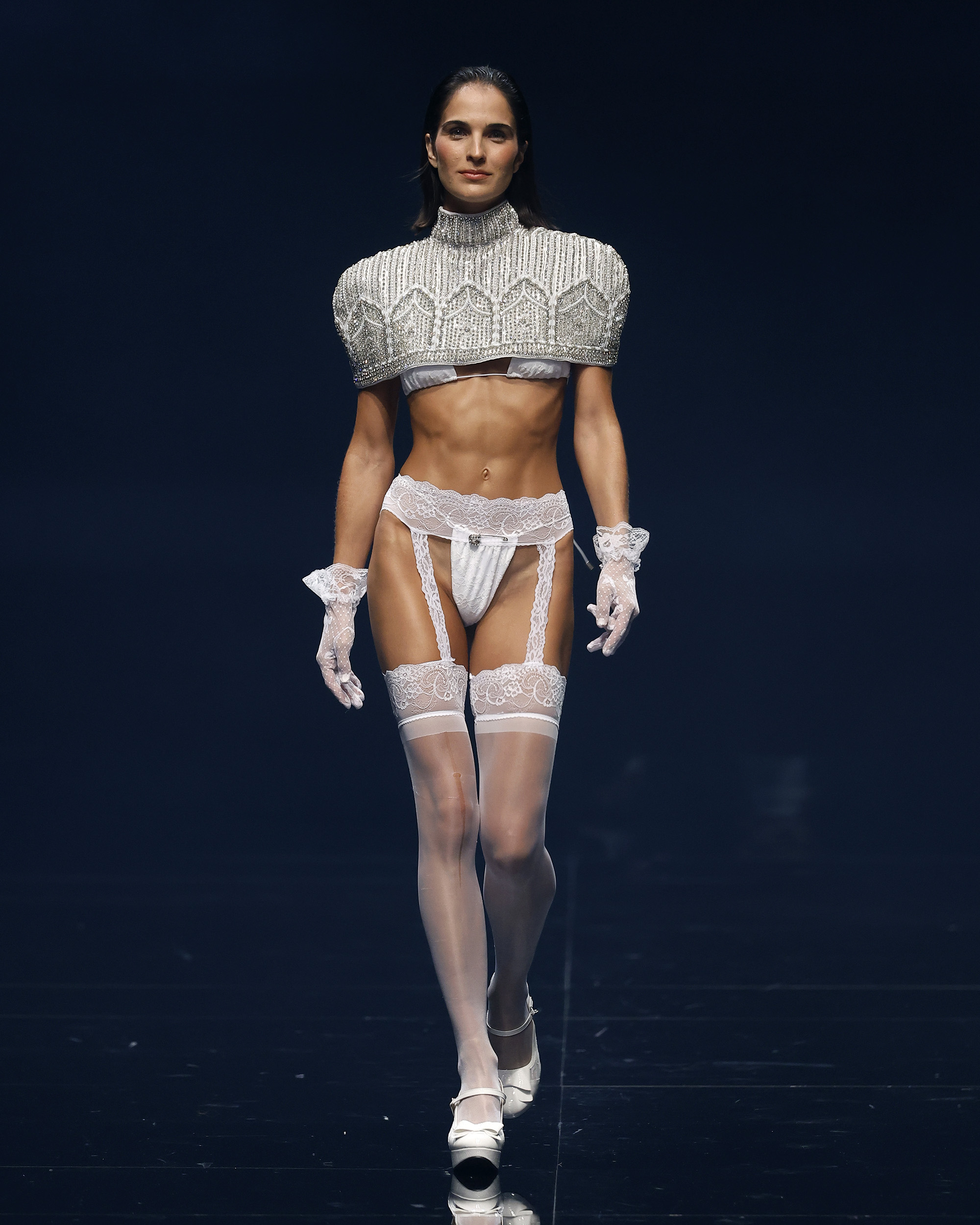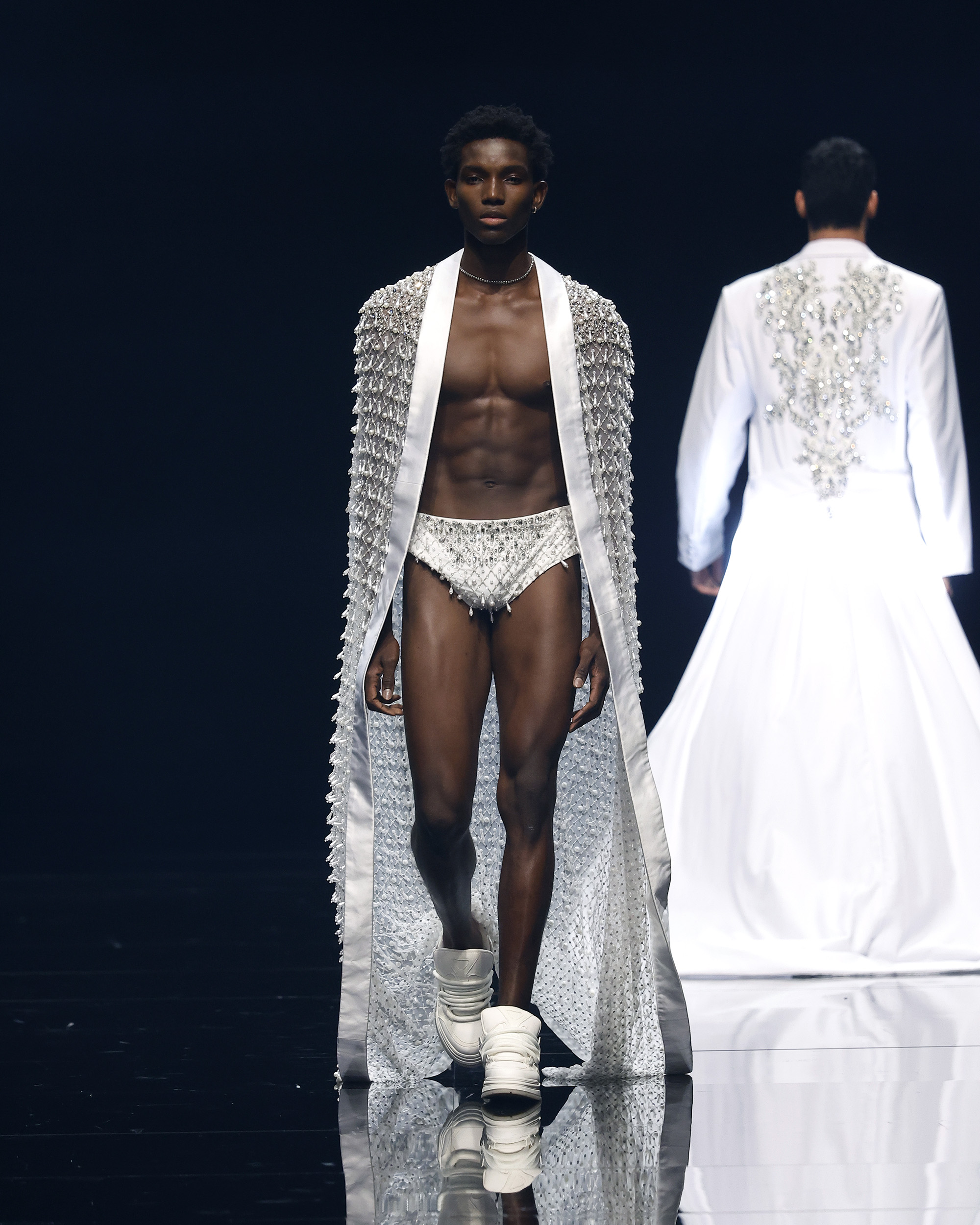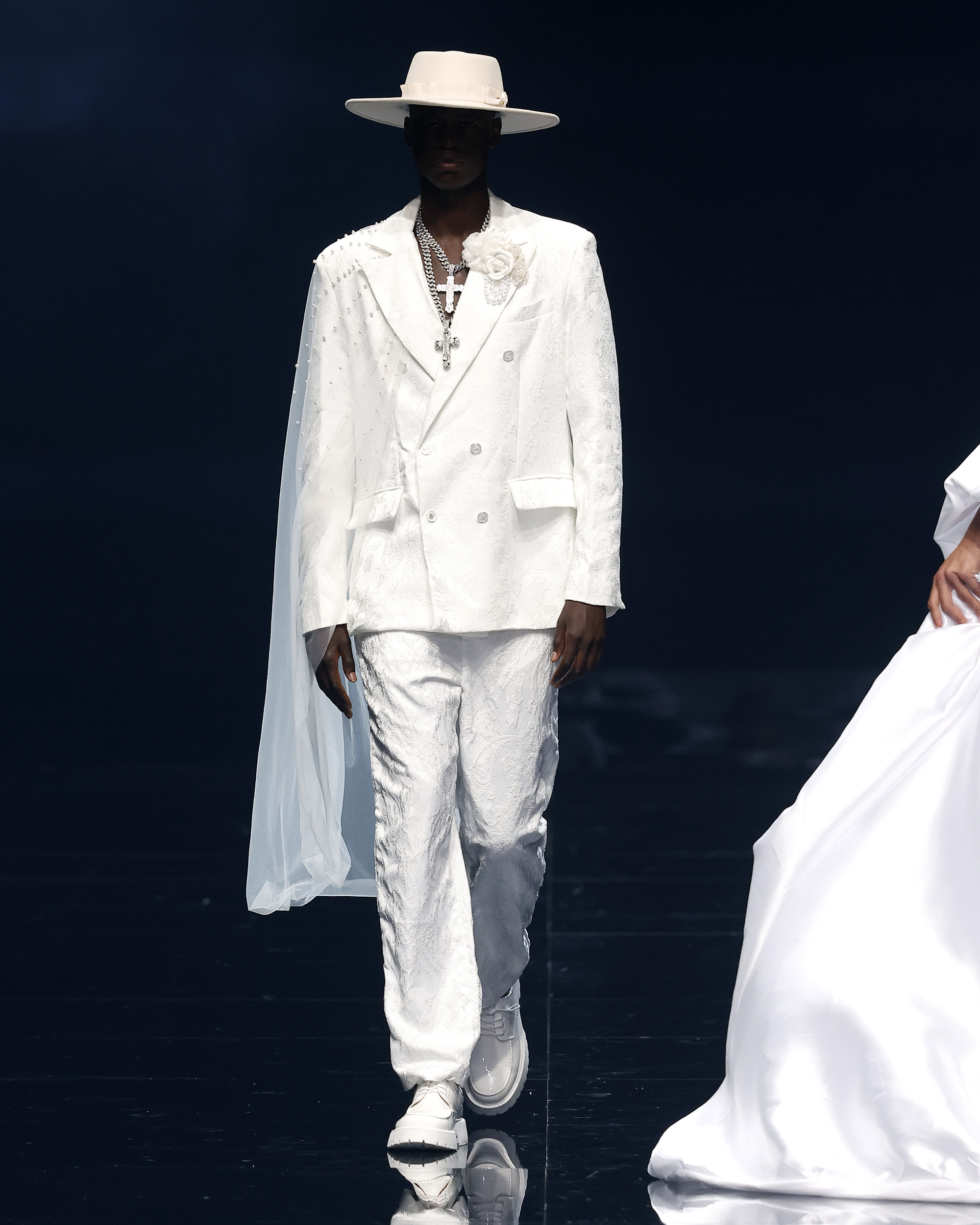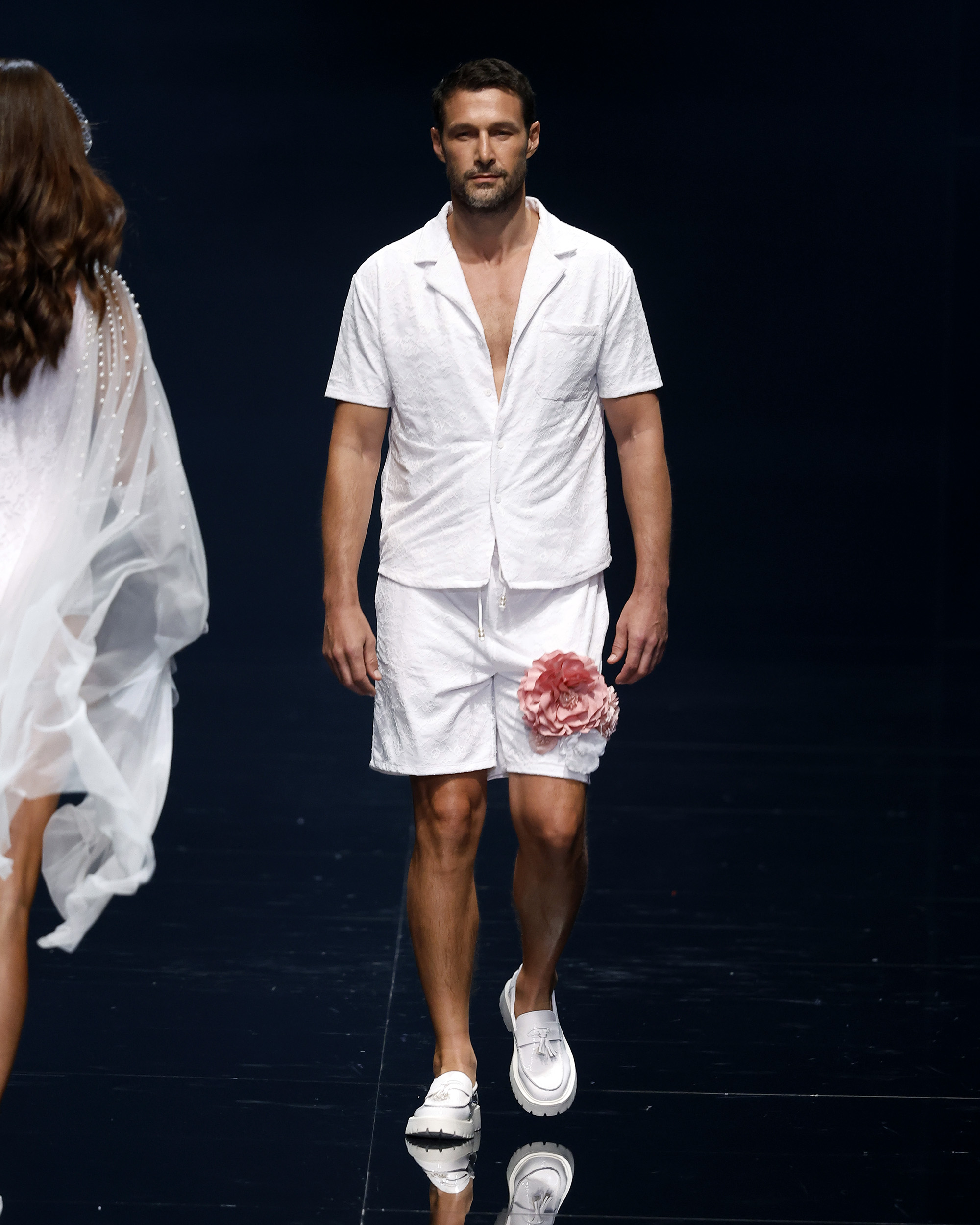 "Mi inspiración para Amour Oui proviene del romance eterno de los viajes y la poesía de las flores, y el poder transformador de la palabra más hermosa del amor: sí." Las flores, como símbolos eternos del amor—rosas para la pasión, lirios para la pureza, peonías para la devoción—se transforman delicadamente en encaje, bordados y detalles exquisitos que florecen en cada creación. En el corazón de la colección yace el momento del "Sí", ese latido en el que el amor se convierte en eterno, capturado en el brillo de las perlas, la suavidad de las sedas drapeadas y la complejidad del trabajo a mano. Cada pieza es una oda a la artesanía hecha a mano, celebrando la tradición atemporal de la alta costura, donde cada puntada es una carta de amor y cada detalle un recuerdo preciado.