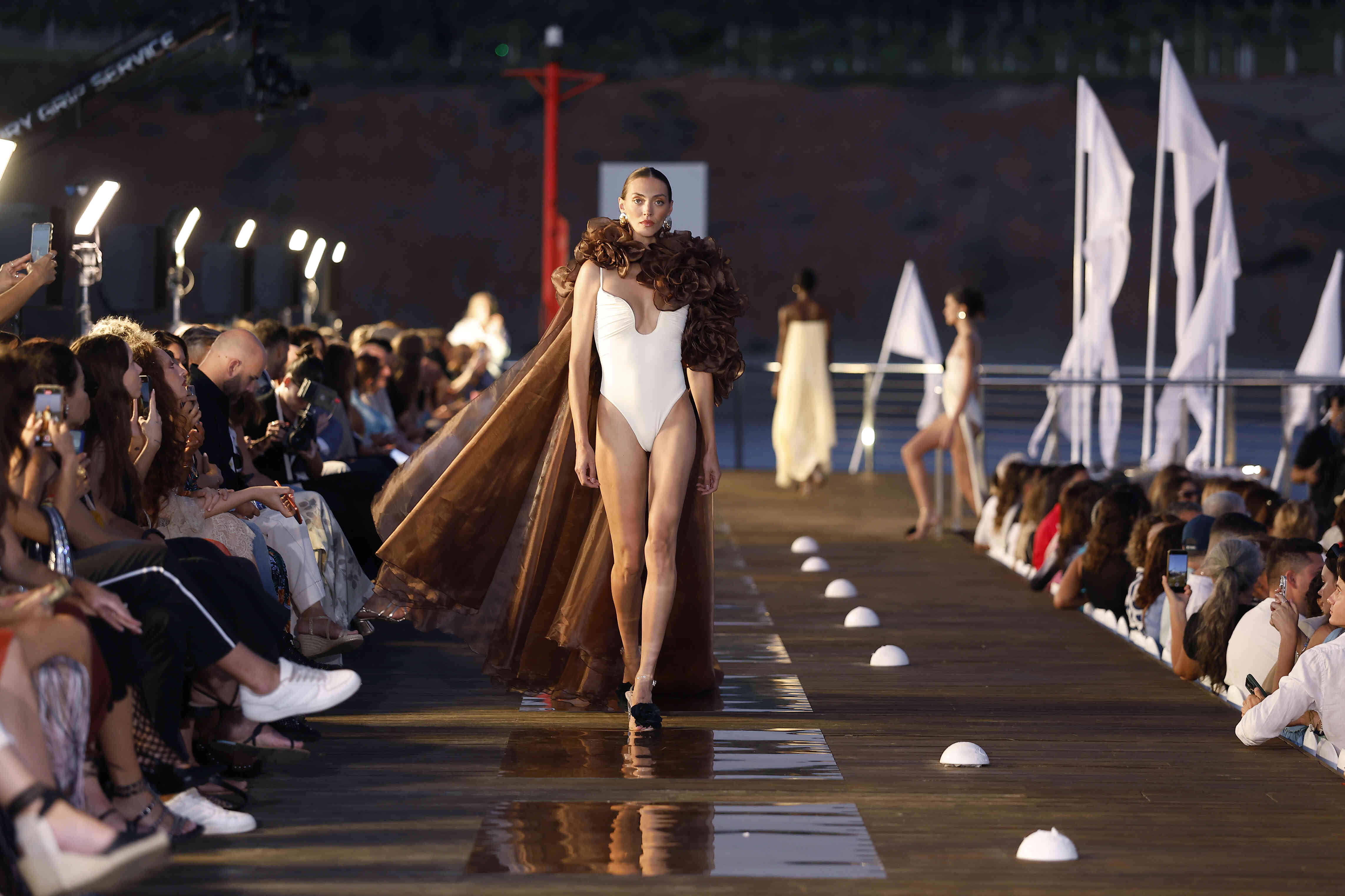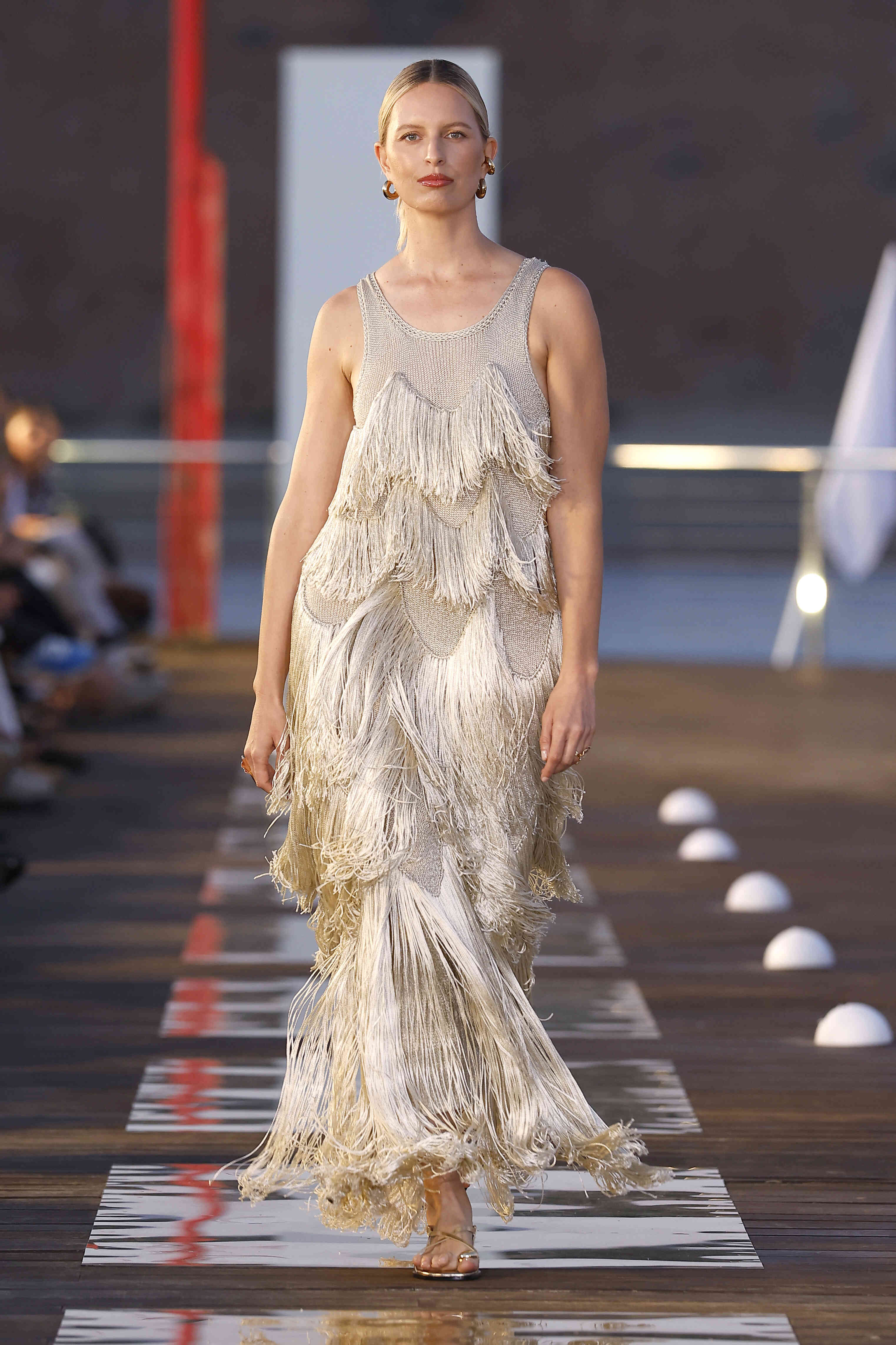 Moda, luz y naturaleza se funden en un mismo reflejo. La pasarela de 135 metros lineales, vestida con espejos dorados, magnífica el entorno: el cielo se dibuja en el suelo, las nubes viajan bajo los pasos de los modelos y los tonos del atardecer brillan con ellos en cada desfile. Alrededor, banderas blancas ondean como parte de la escenografía, abrazando la pasarela.