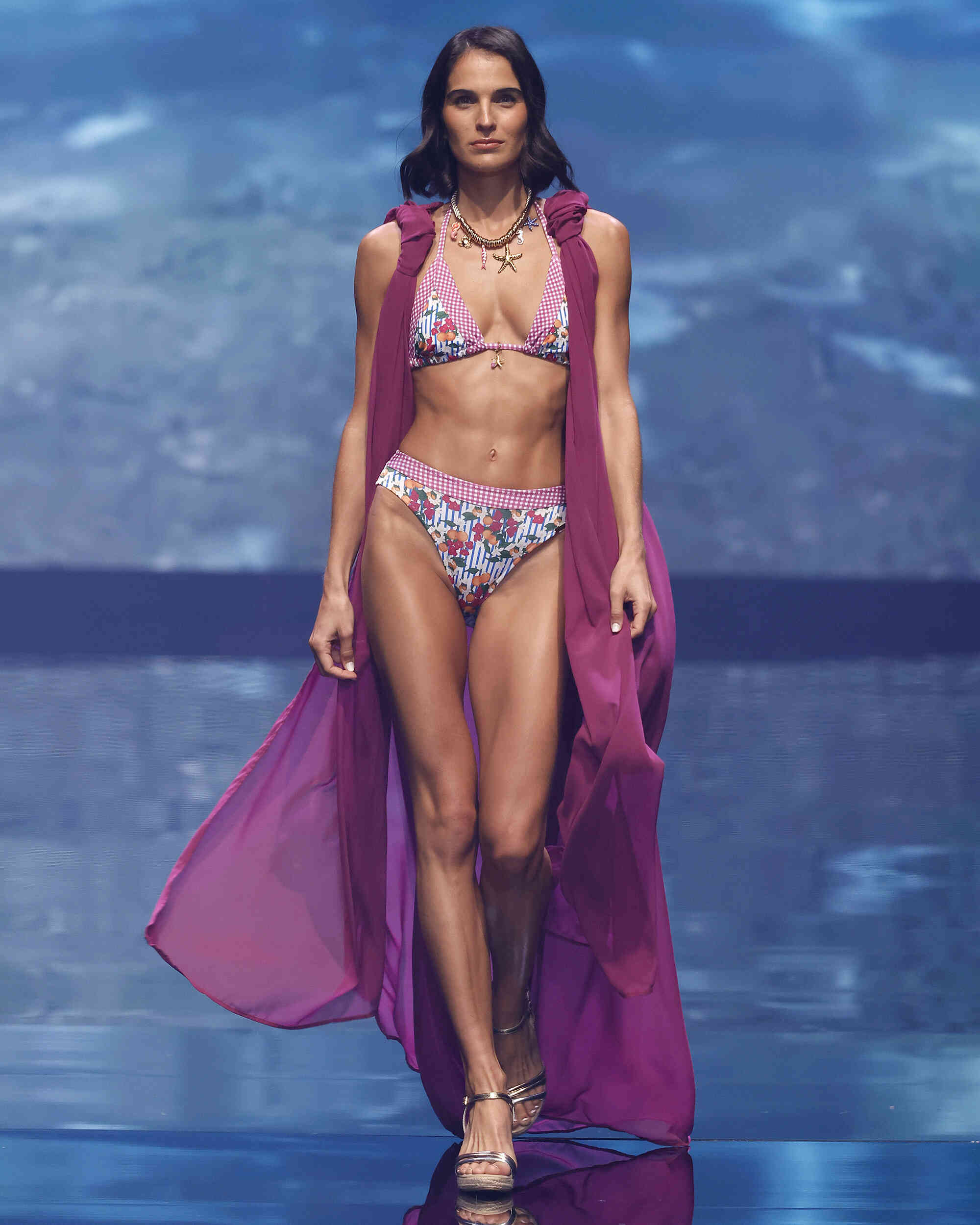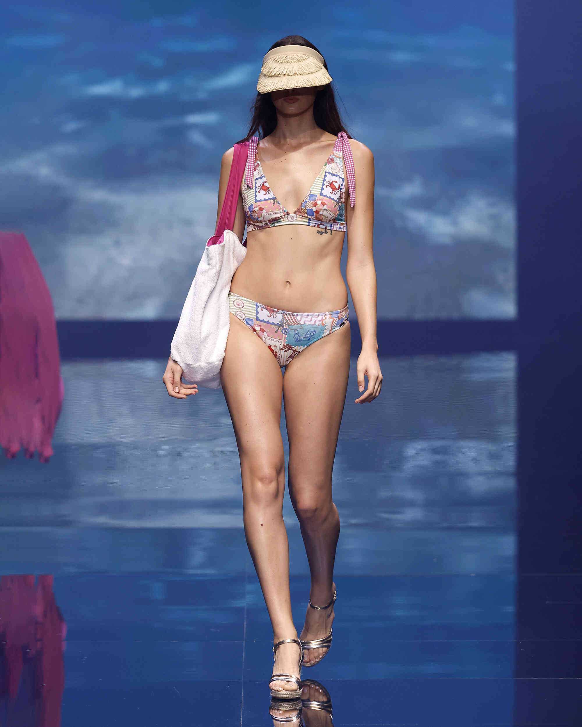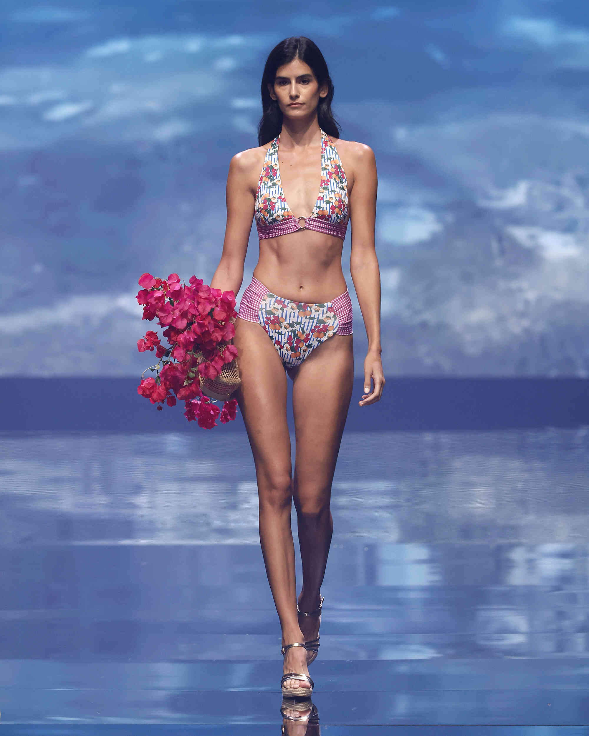 Desarrollada 100% en España, esta colección celebra la belleza y sostenibilidad en cada detalle. En ella los colores azul, blanco, fucsia y naranja se fusionan con estampados exclusivos que evocan elementos del mar y la tierra. Los bañadores y bikinis de cortes favorecedores, confeccionados con lycras recicladas o reciclables certificadas, se complementan con pareos, vestidos, camisas, pantalones y chaquetas en tejidos ligeros como gasa y satén de algodón entre otros.