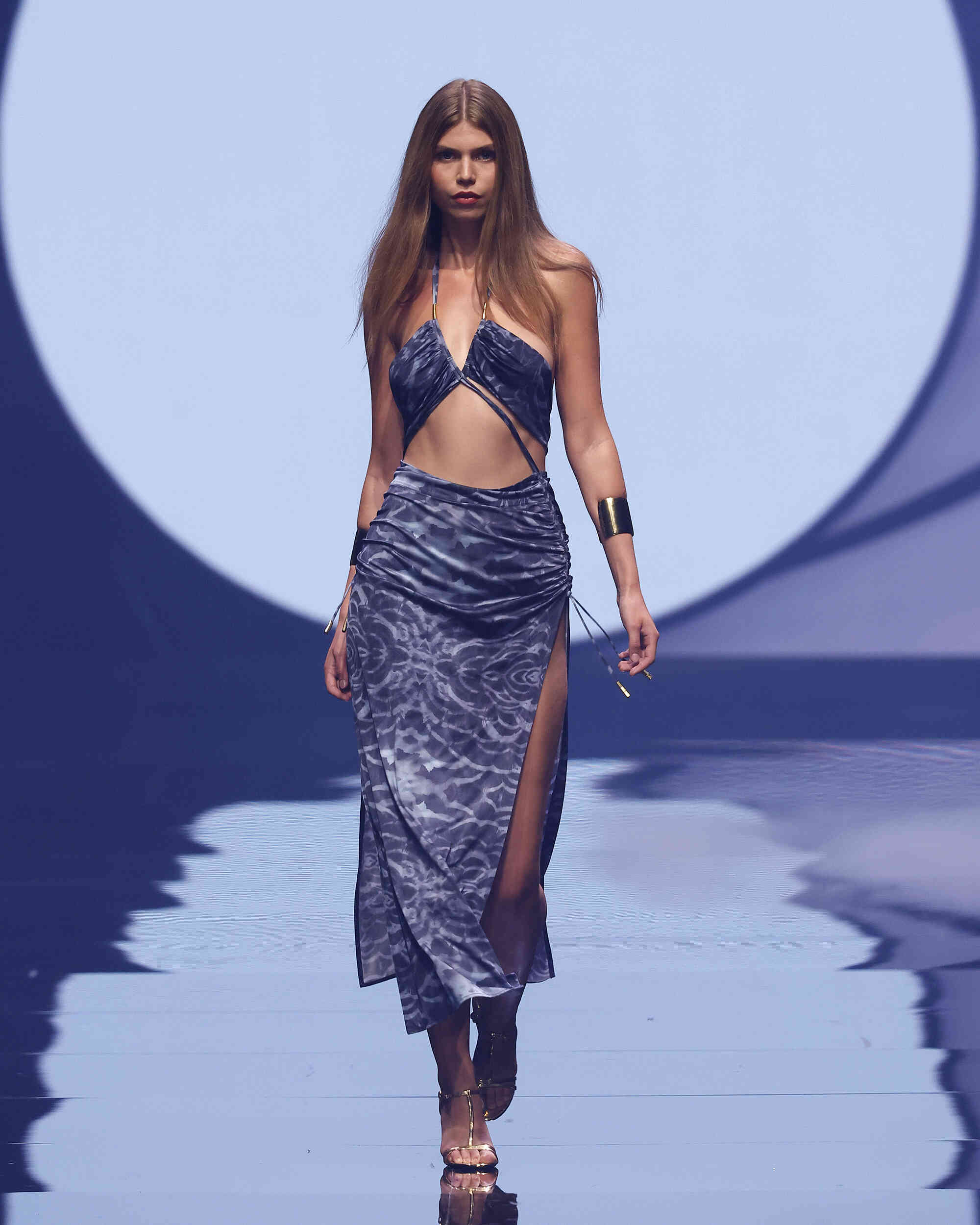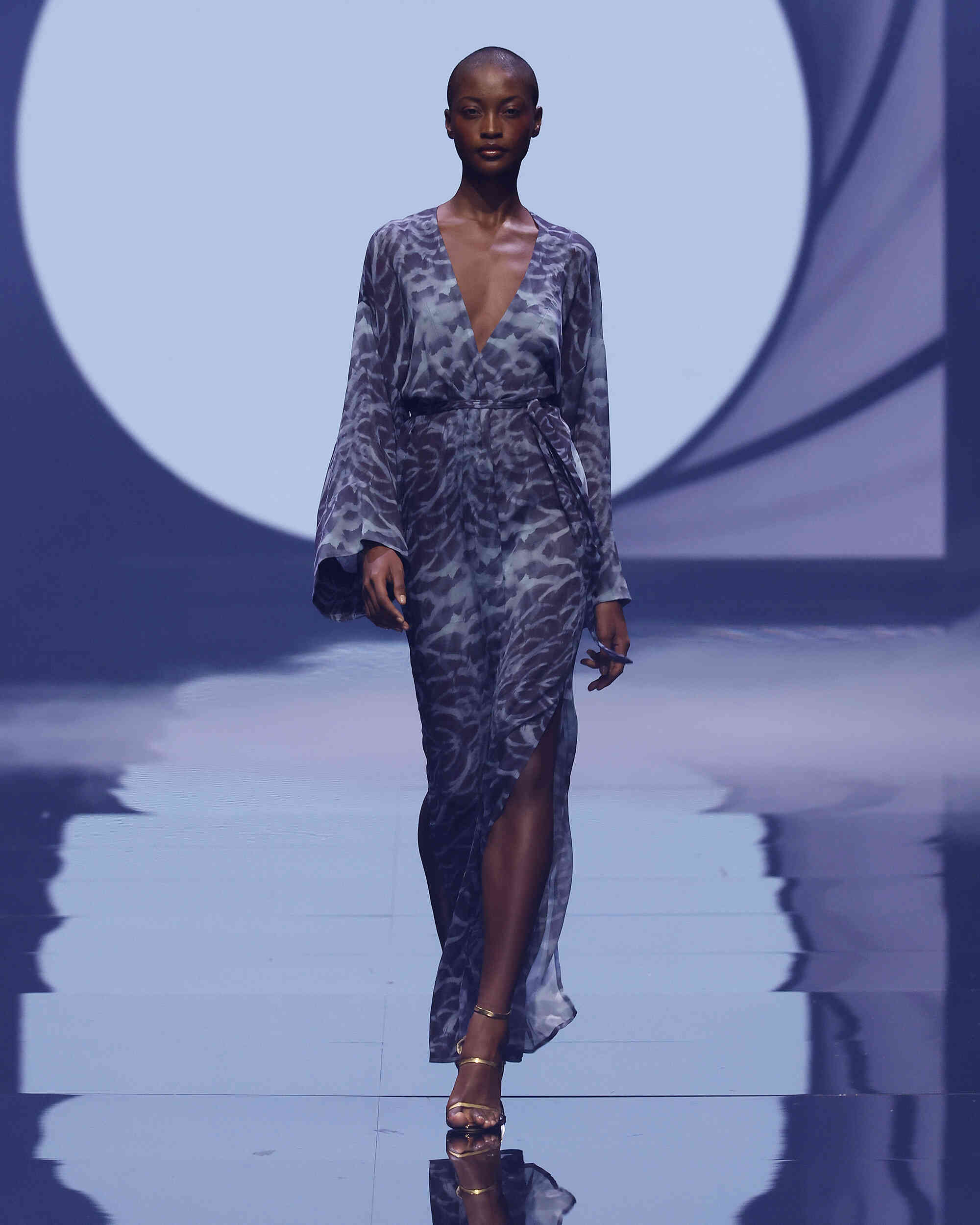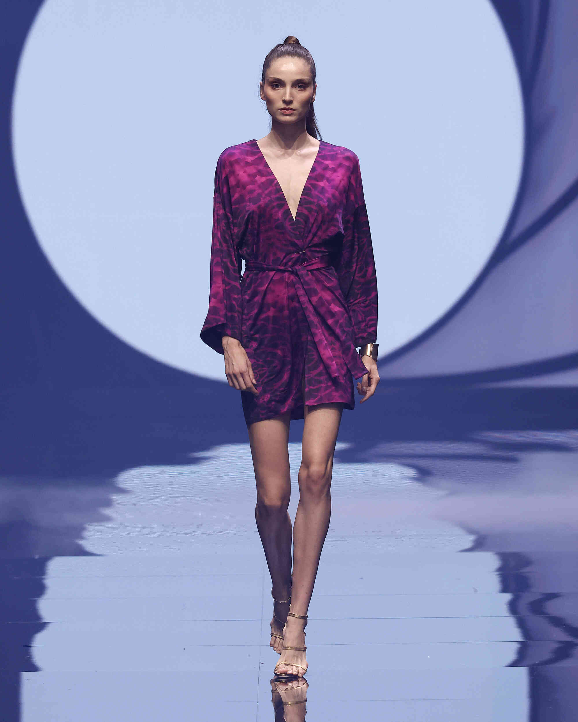 Carlos San Juan propone una Colección, envuelta en un halo de misterio y sensualidad. Diseñada para mujeres sexys y sofisticadas, esta Colección es una invitación irresistible a celebrar los días y las noches en los destinos más exclusivos del mundo. Prendas de vestir confeccionadas en tejidos de chiffon y jersey de viscosa, acarician la piel en cada movimiento. Cada prenda es una obra de arte, diseñada para abrazar y celebrar el cuerpo femenino, destacando su belleza y sensualidad de manera natural. Destaca el personalísimo estampado, que en contraste con las piezas metálicas doradas, crean una presencia sofisticada y atemporal. En esta Colección el color protagonista es el Gris Vulcano, que se muestra en tonos lisos o mezclándose sutilmente con el Verde Jade, el Azul Iris y el Rosa Mexicali.