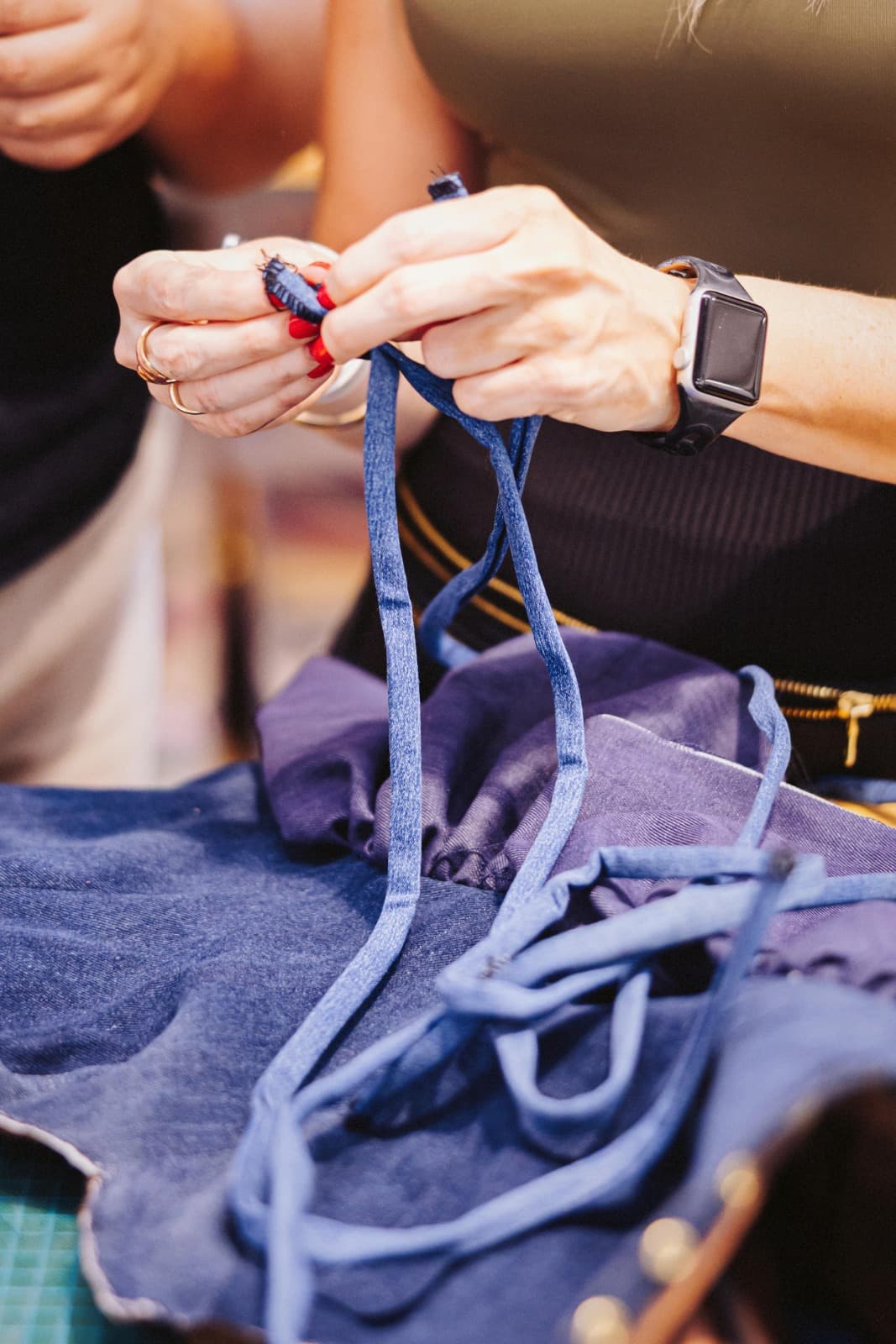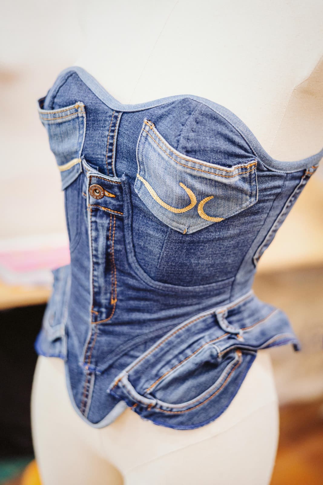 El taller, que se desarrolló entre las 9:00 y las 14:00 horas, propuso una experiencia práctica centrada en la transformación de prendas vaqueras en tops encorsetados. A través de la técnica del upcycling (reutilizar materiales y productos para crear nuevos de mayor valor, tanto ecológico como económico). Hansen introdujo a los participantes en un proceso creativo que combina el moulage (dar forma a la tela directamente sobre un maniquí para crear una prenda en 3D) y el patronaje no convencional, desafiando las normas tradicionales de la confección para abrir nuevas vías pedagógicas y de diseño.